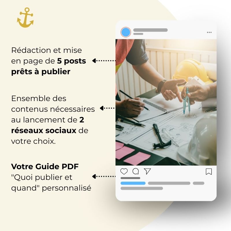 - La rédaction et la mise en page de 5 posts prêts à publier — adaptés à votre activité BTP