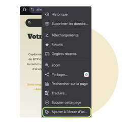 Dans votre navigateur, ouvrez le menu (souvent “⋮” ou “Partager”). Sélectionnez « Ajouter à l’écran d’accueil » ou « Installer l’application ».